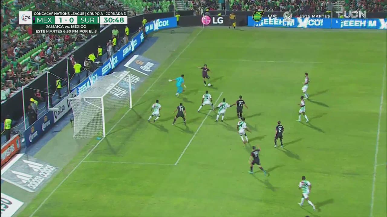 Henry Martín prolonga la jugada y le queda al atacante de México, pero el portero está atento.