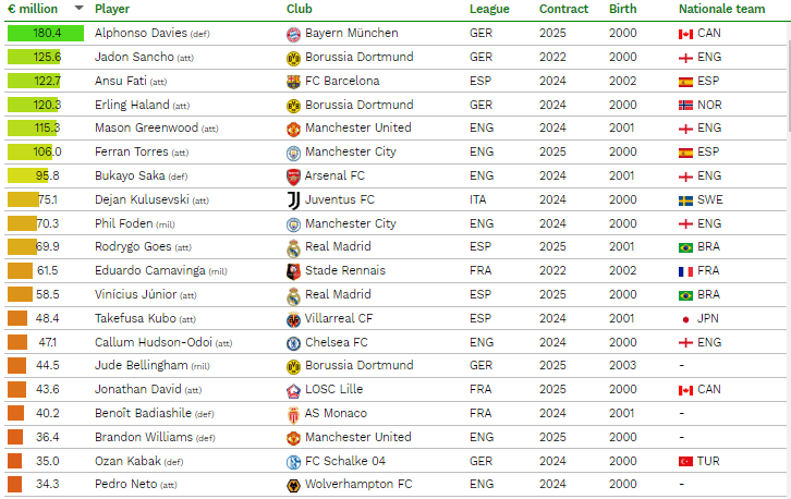 En la lista aparecen nombre muy reconocidos como Ansu Fati, del Barcelona, Vinícius y Rodrygo, del Real Madrid, Ferrán Torres, del Manchester City, o Jadon Sancho y Erling Haland, del Borussia Dortmund, entre otros, pero el jugador del Bayern es quien encabeza este listado.