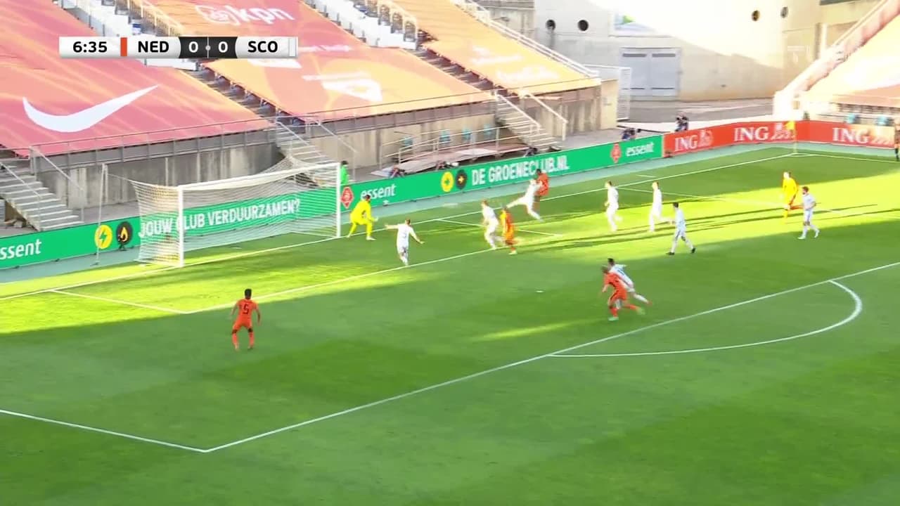 Denzel Dumfries (Holanda) remata al poste derecho| Disparo con la derecha sin ángulo desde la derecha. Asistencia de Wout Weghorst.