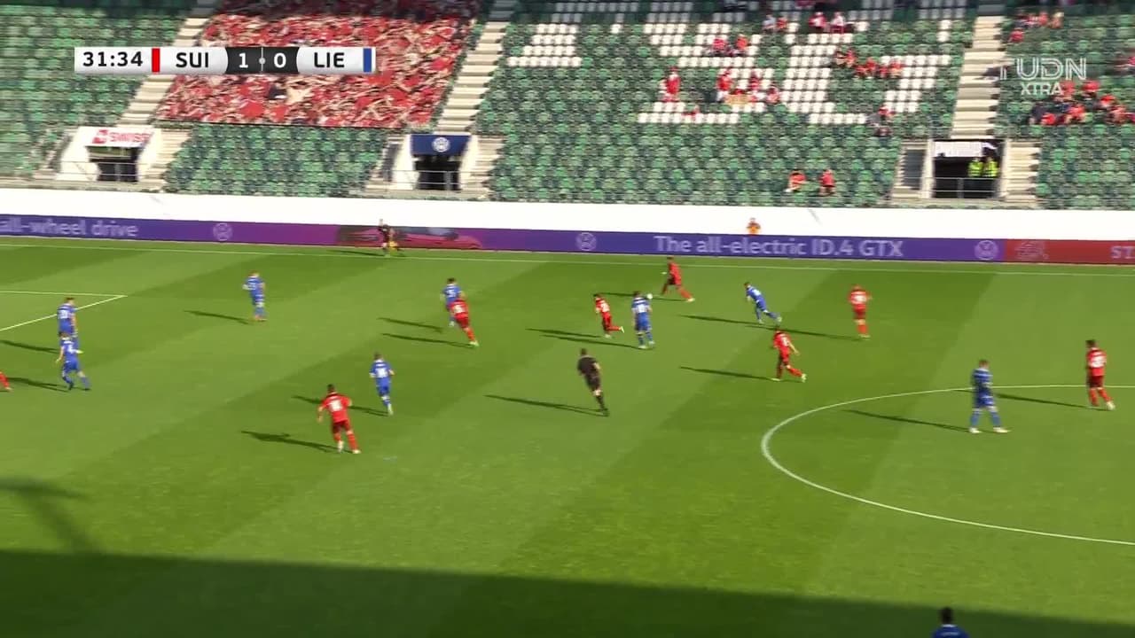 Mario Gavranovic (Suiza) remata al travesaño| disparo de cabeza desde el centro del área. Asistencia de Kevin Mbabu con un centro al área.