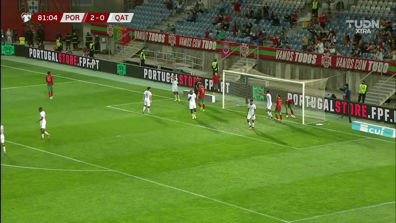 Rafael Leão (Portugal) remata al travesaño| Disparo con la derecha desde fuera del área. Asistencia de Bruno Fernandes.