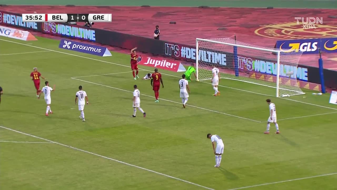 Thorgan Hazard (Bélgica) remata al poste izquierdo| zurdazo a quemarropa desde el lado izquierdo. Asistencia de Jéremy Doku.