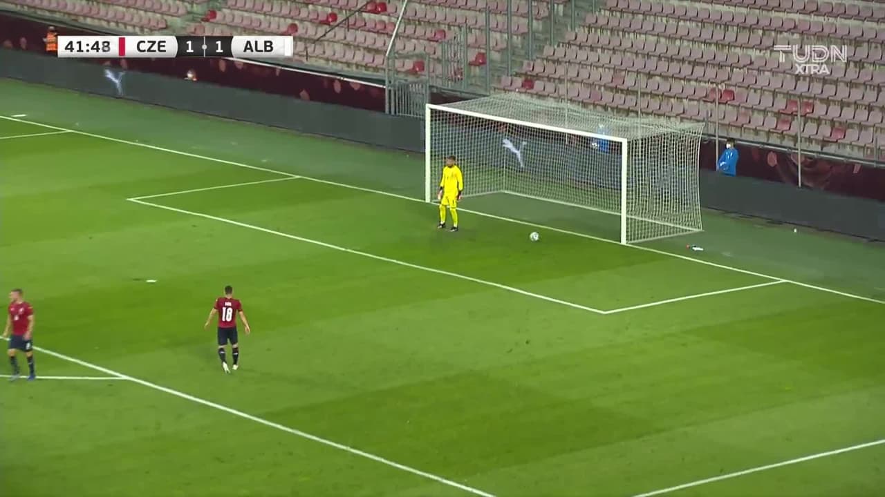 ¡Gol! República Checa 1| Albania 1. Sokol Cikalleshi (Albania) Disparo con la derecha desde el centro del área al centro de la portería.