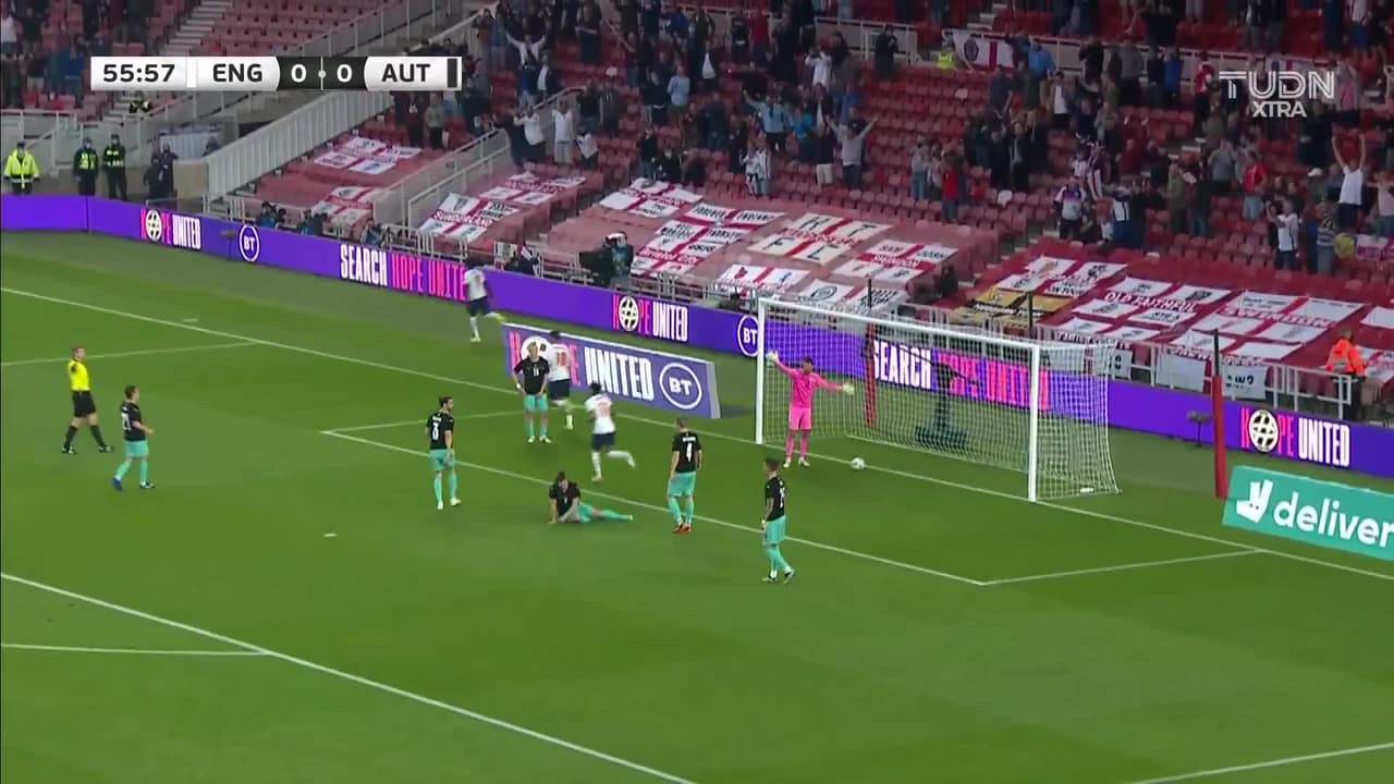 ¡Gol! Inglaterra 1| Austria 0. Jack Grealish (Inglaterra) zurdazo a quemarropa desde el lado izquierdo al centro de la portería.
