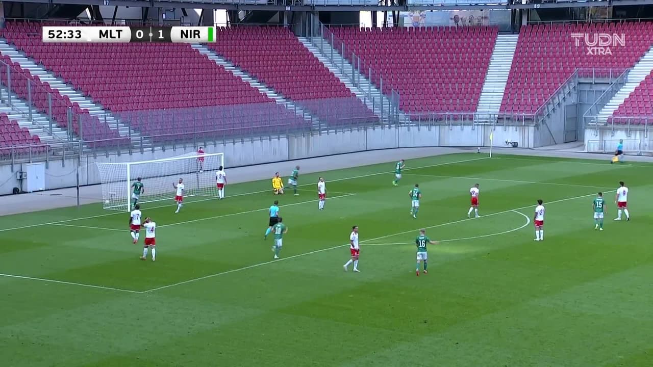 ¡Gol! Malta 0| Irlanda del Norte 2. Gavin Whyte (Irlanda del Norte) Disparo con la derecha desde el lado derecho dentro del área.
