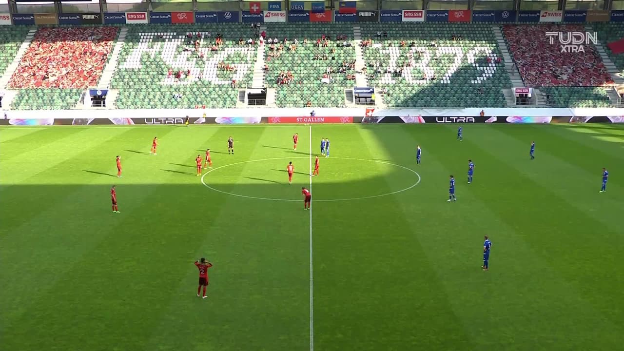 ¡Gol! Suiza 2| Liechtenstein 0. Christian Fassnacht (Suiza) zurdazo desde el centro del área.
