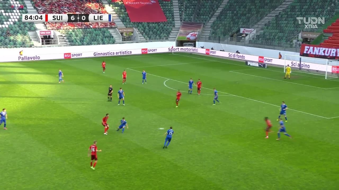 ¡Gol! Suiza 7| Liechtenstein 0. Edimilson Fernandes (Suiza) Disparo con la derecha desde el centro del área.