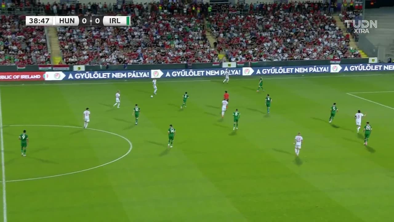 Tiro atajado junto al lado derecho de la portería. Ádám Szalai (Hungría) disparo de cabeza desde el centro del área. Asistencia de Attila Szalai con un centro al área.