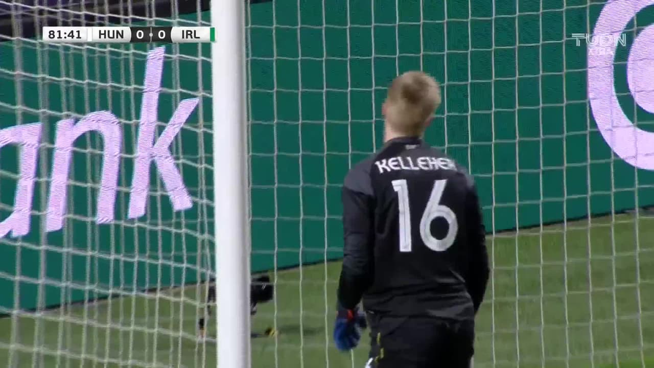 Tiro atajado Por arriba en el centro del arco. Ádám Szalai (Hungría) disparo de cabeza desde el centro del área. Asistencia de Ákos Kecskés con un centro al área.