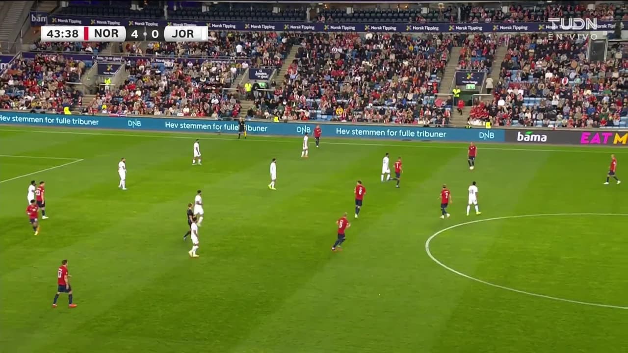 Tiro atajado. Antonio Nusa (Noruega) Disparo con la derecha desde fuera del área.