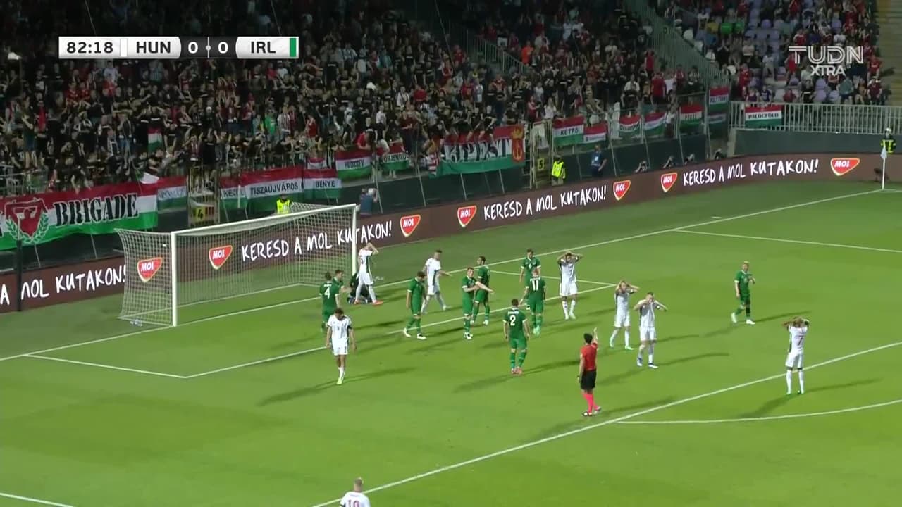 Tiro atajado Por arriba en el centro del arco. Attila Szalai (Hungría) zurdazo desde el centro del área.