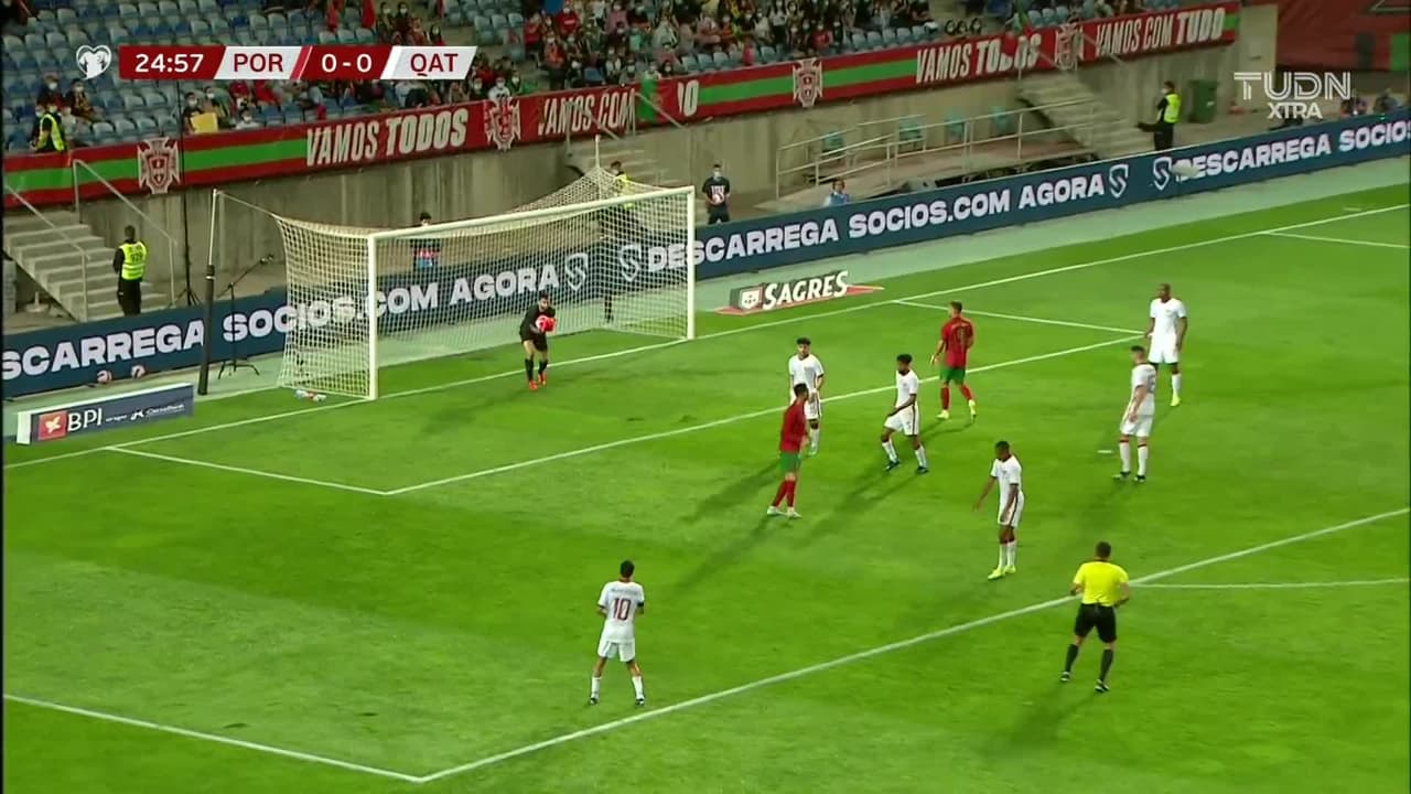 Tiro atajado raso al centro del arco. Cristiano Ronaldo (Portugal) disparo de cabeza desde el centro del área. Asistencia de Diogo Dalot con un centro al área.