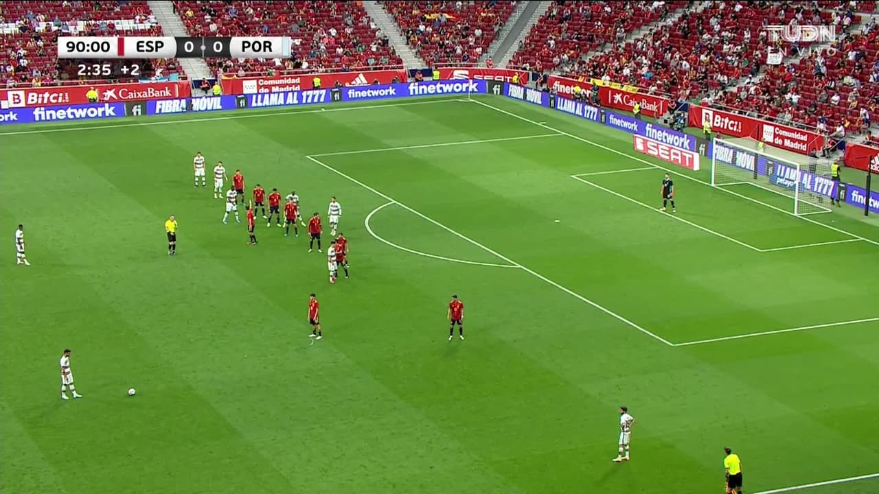 Tiro atajado. Danilo Pereira (Portugal) disparo de cabeza desde el centro del área.