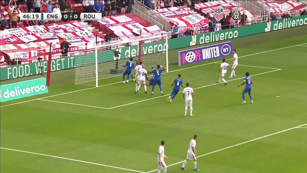 Tiro atajado. Dominic Calvert-Lewin (Inglaterra) Disparo con la derecha desde muy cerca.