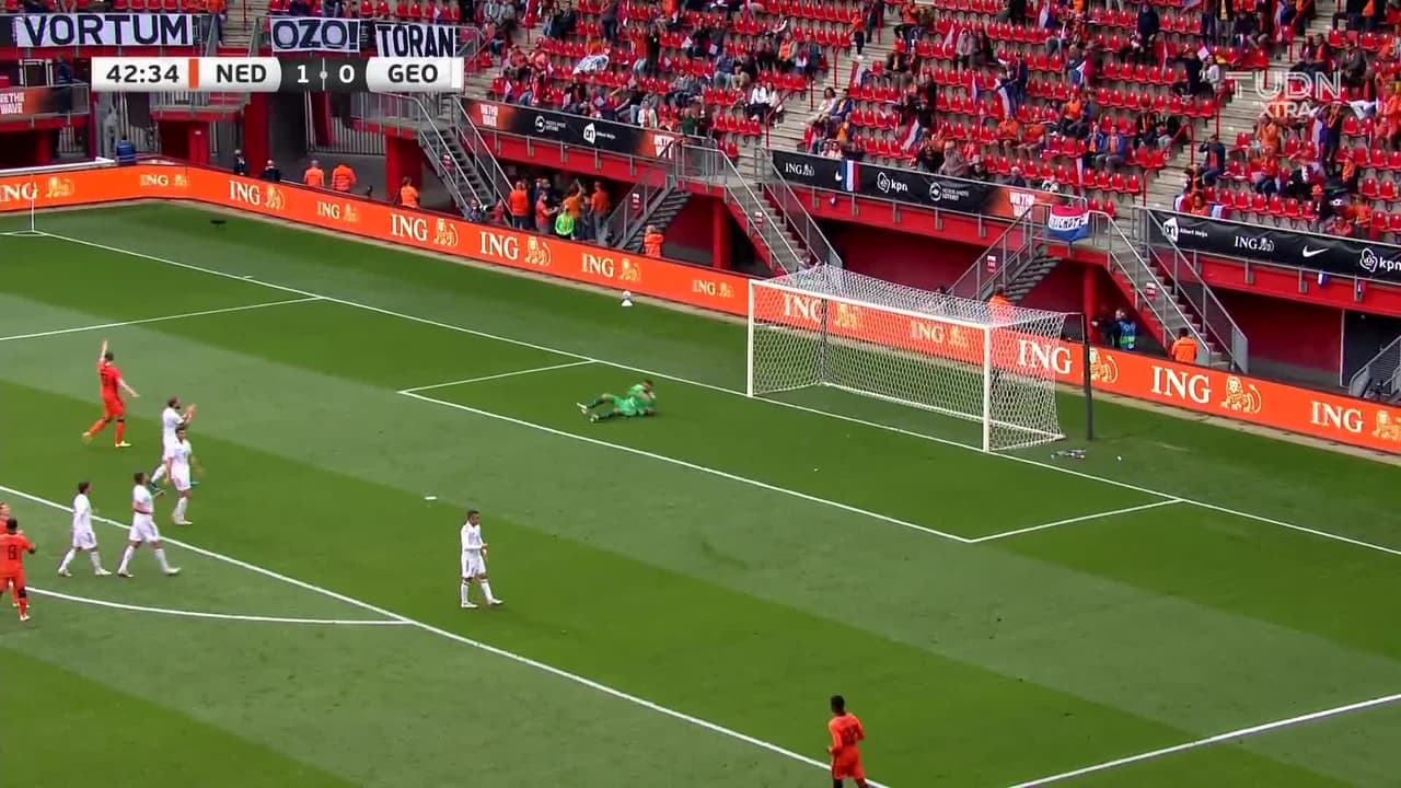 Tiro atajado. Frenkie de Jong (Holanda) Disparo con la derecha desde fuera del área.