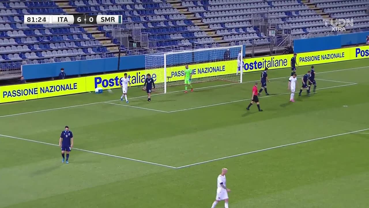 Tiro atajado. Giovanni Di Lorenzo (Italia) disparo de cabeza sin ángulo desde la derecha.