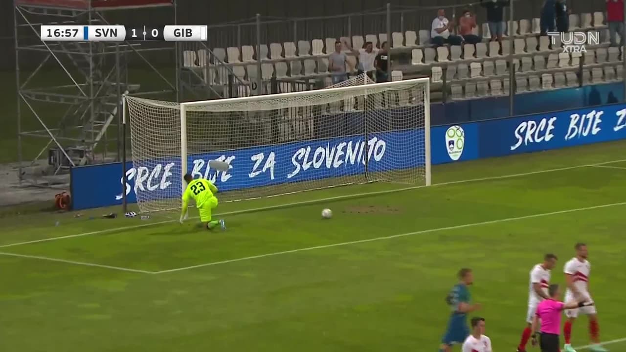 Tiro atajado. Keneth Chipolina (Gibraltar) Disparo con la derecha desde el centro del área.