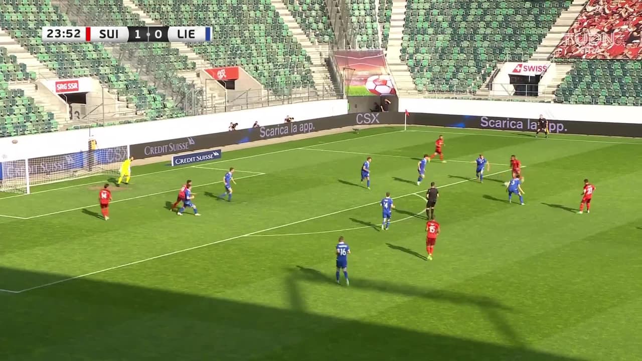 Tiro atajado. Kevin Mbabu (Suiza) zurdazo desde fuera del área.