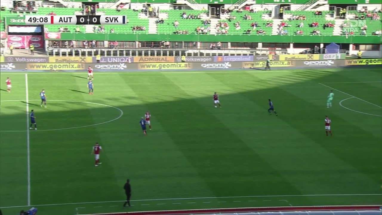 Tiro atajado raso al centro del arco. Konrad Laimer (Austria) Disparo con la derecha desde fuera del área.