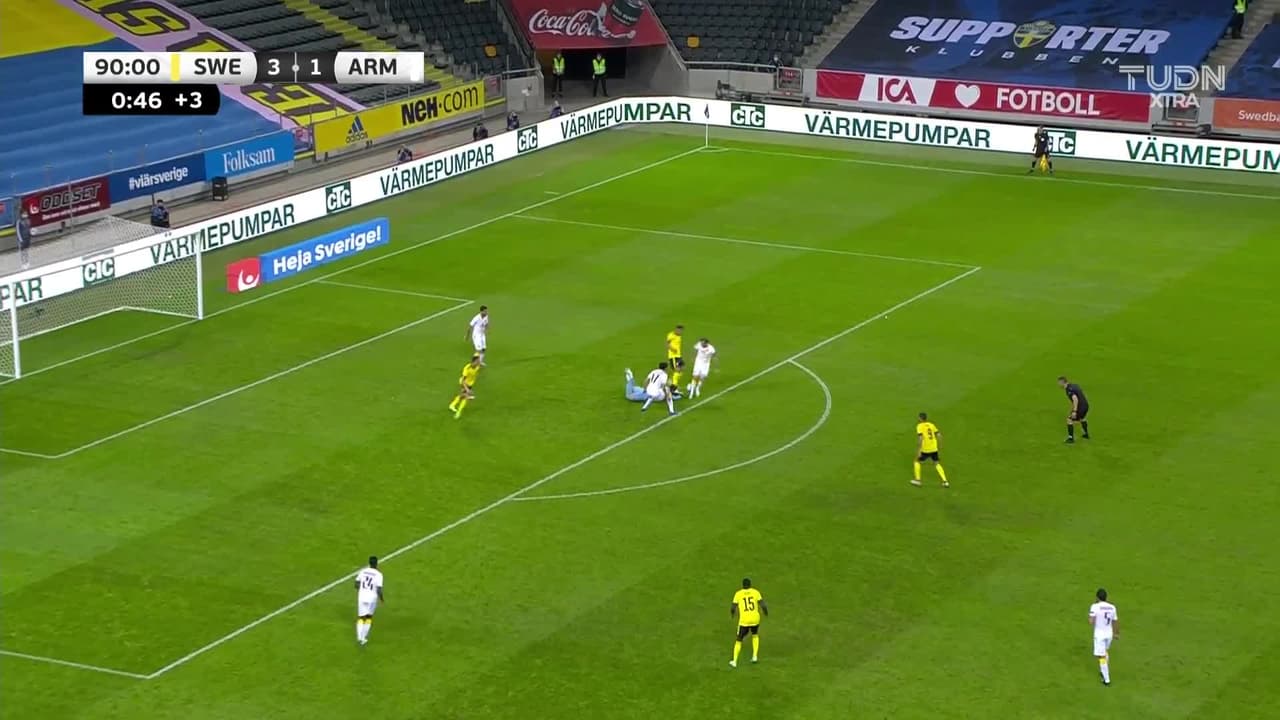 Tiro atajado raso al centro del arco. Robin Quaison (Suecia) Disparo con la derecha desde fuera del área.