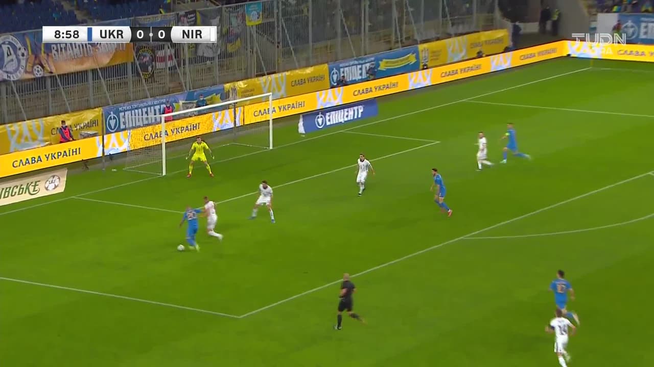 Tiro atajado por abajo a la izquierda. Roman Yaremchuk (Ucrania) zurdazo desde el centro del área. Asistencia de Oleksandr Zubkov.