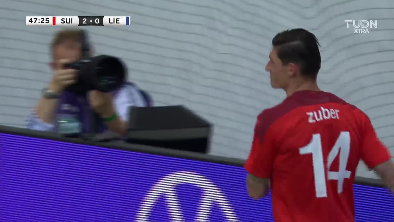 Tiro atajado raso al centro del arco. Steven Zuber (Suiza) Disparo con la derecha desde el lado izquierdo dentro del área. Asistencia de Ruben Vargas.