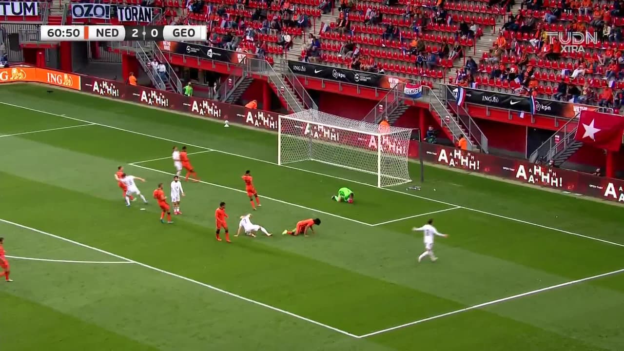 Tiro atajado junto al lado derecho de la portería. Valeriane Gvilia (Georgia) Disparo con la derecha desde el centro del área.