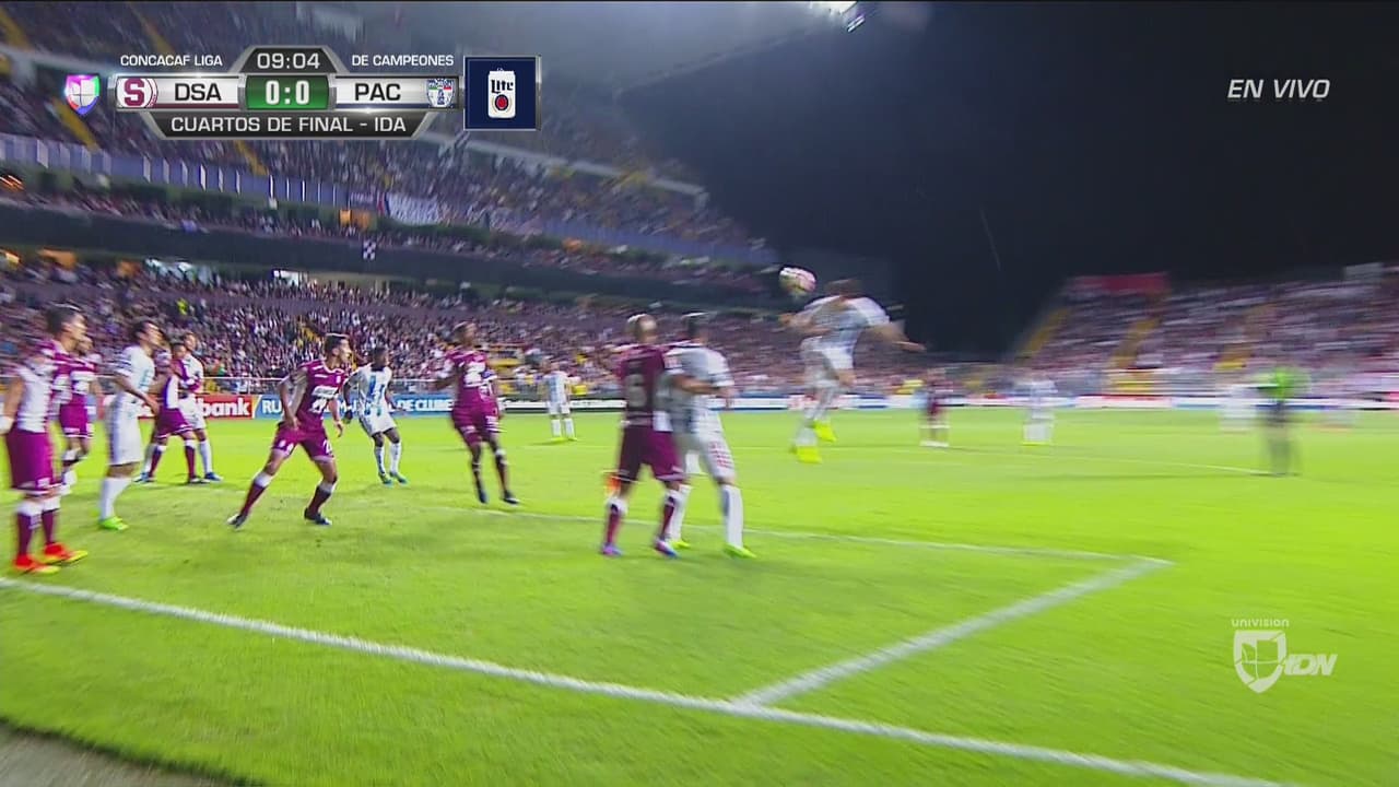 El defensor de los Tuzos se levantó con autoridad dentro del área, pero el defensor del conjunto tico evitó la anotación en la raya.