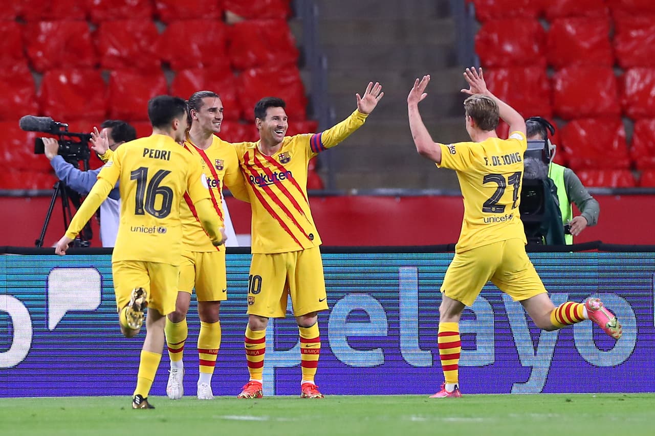 El delantero francés del Barcelona Antoine Griezmann también hace lo propio de Lionel Messi tras ganar la Copa del Rey ante Athletic Club.