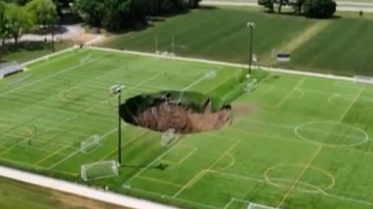 Aparece un hoyo gigante en cancha de futbol en Illinois, no se reportan muertos