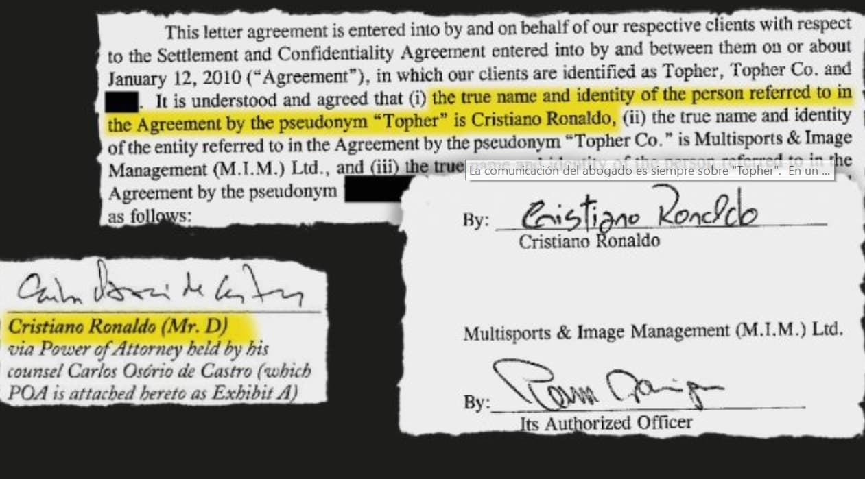 -En el acercamiento del acuerdo se puede ver cómo Cristiano Ronaldo es denominado ‘Topher’ para mantener oculta su identidad.