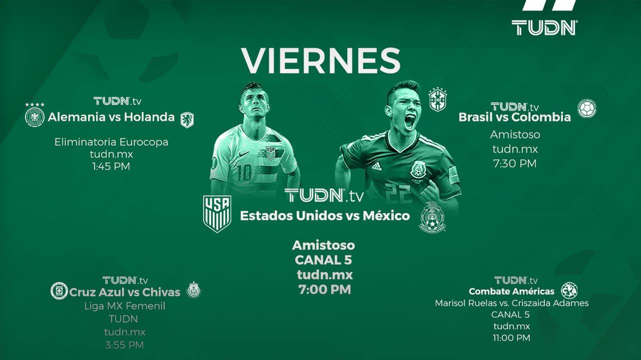 Ya lo sabes, Estados Unidos y México es el platillo principal de este viernes de futbol de locura y podrás seguir tados estos evenbtos a través de las pantallas de TUDN y tudn.tv y todas sus plataformas.
