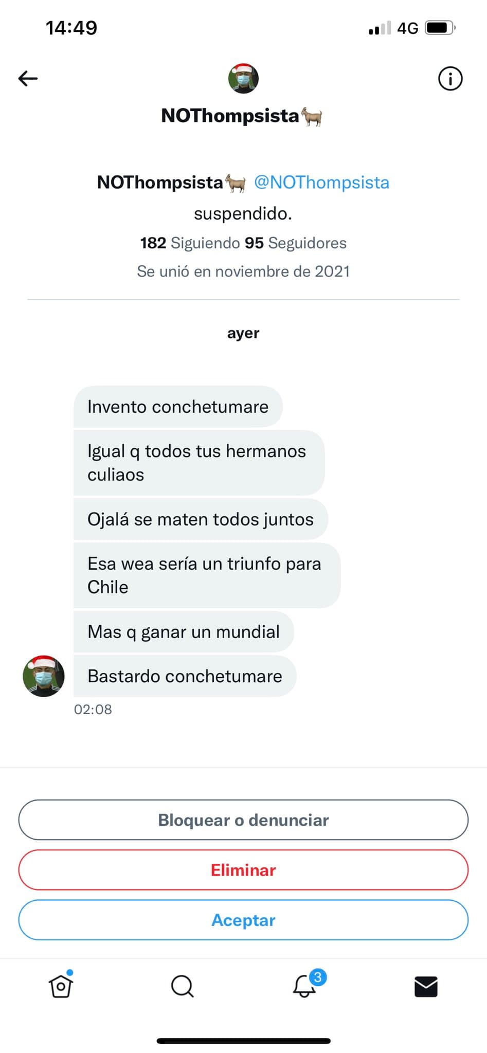 "Invento conchetumare, igual que todos tus hermanos culiaos. Ojalá se maten todos juntos, esa wea sería un triunfo para Chile, más que ganar un Mundial. Bastardo conchetumare", fueron los mensajes que le escribió el usuario @NOThompsista a Galdames.