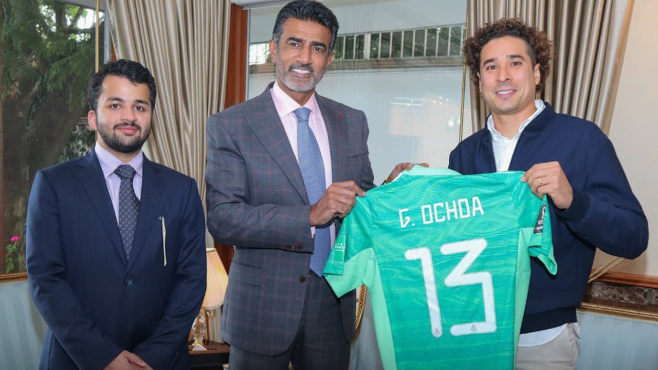 En otra imagen se aprecia a ambos sosteniendo una camiseta de la Selección Mexicana con el nombre y número de Memo Ochoa, regalo de parte del portero de los azulcremas hacia el representante catarí en nuestro país.