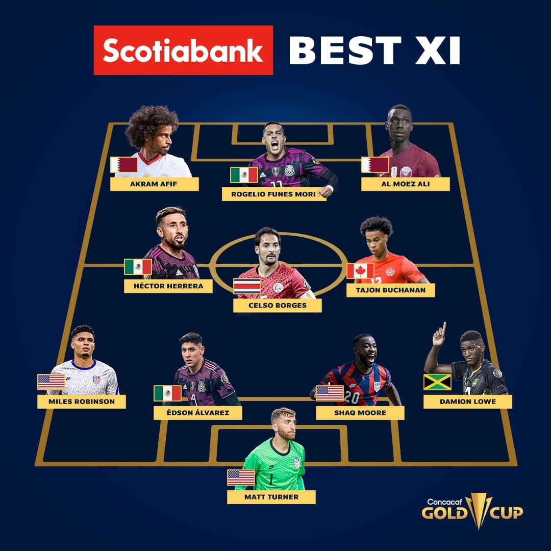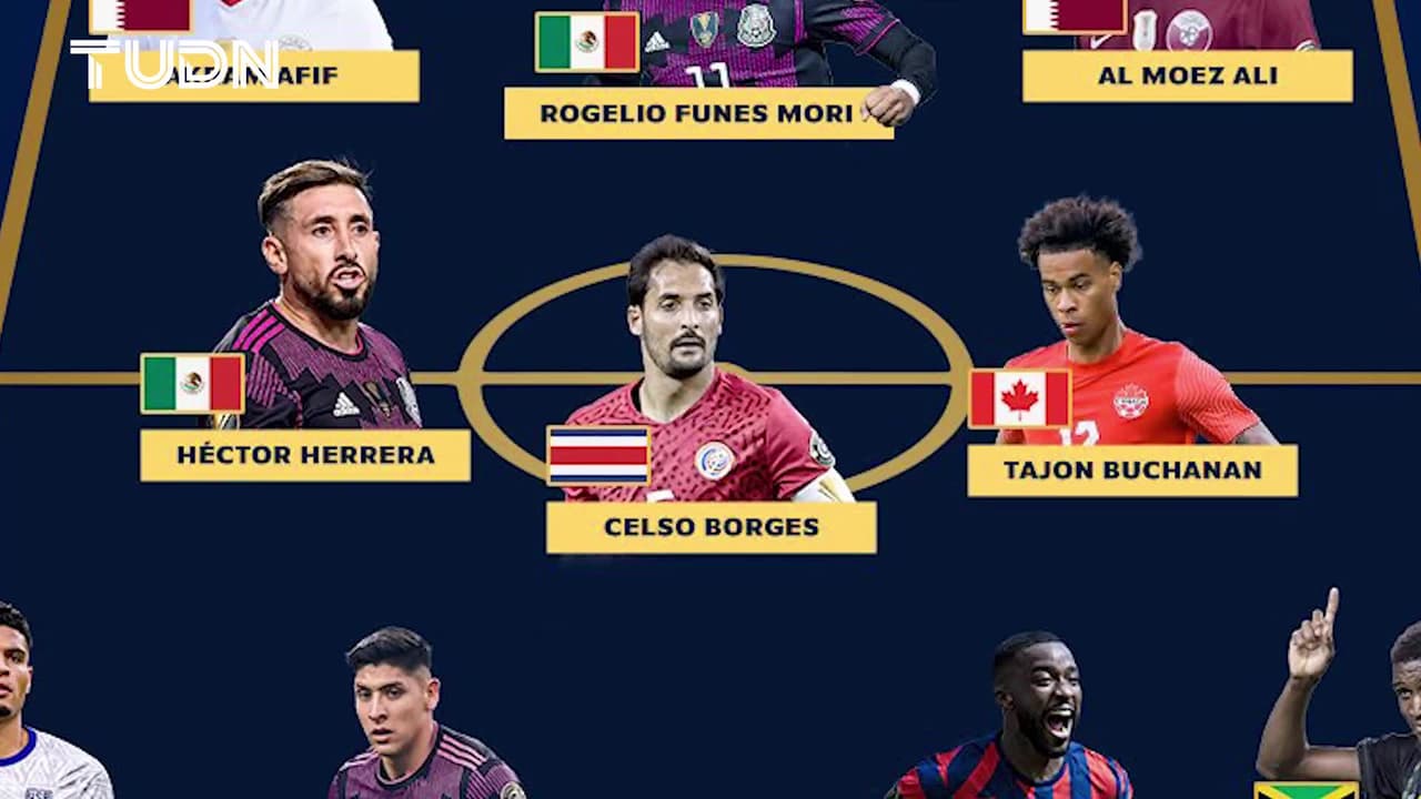 Matt Turner (Estados Unidos); Damion Lowe (Jamaica), Shaq Moore(Estados Unidos), Edson Álvarez (México), Miles Robinson (Estados Unidos); Celso Borges (Costa Rica), Tajon Buchanan (Canadá), Héctor Herrera(México); Al Moez Ali (Catar), Rogelio Funes Mori (México) y Akram Afif (Catar).