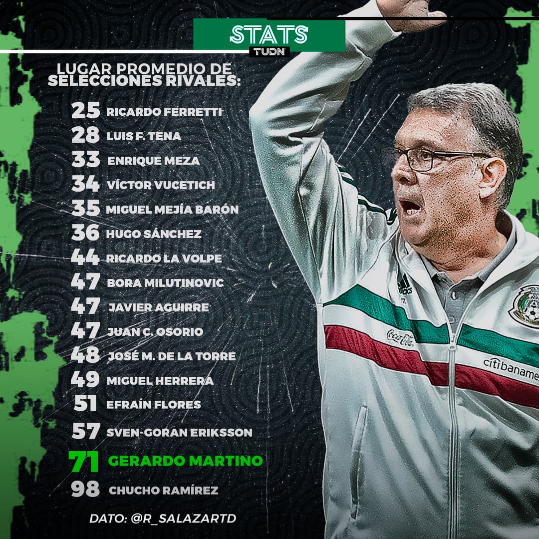 Así, ‘Tata’ Martino es el técnico con el segundo más bajo promedio de rivales según la clasificación de la FIFA al momento de enfrentarlos; es decir, el argentino se midió ante rivales cuyo promedio oscila un lugar en el ranking 71, de acuerdo a Ricardo Salazar, de TUDN.