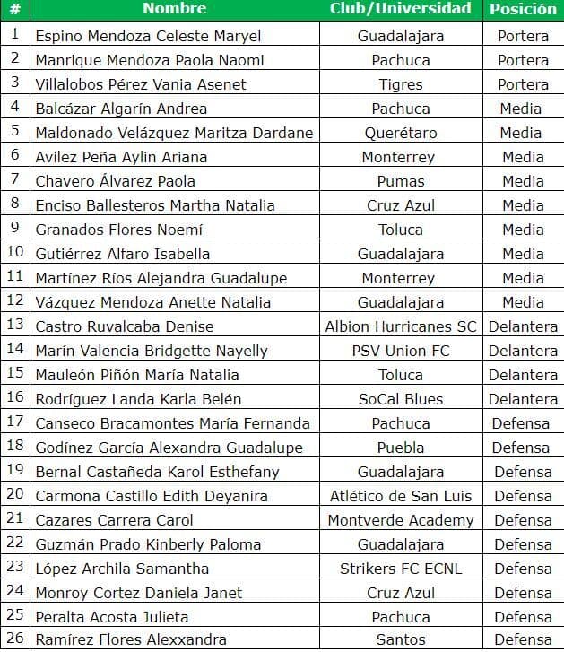 Después de Chivas, Pachuca es el segundo equipo con más elementos convocados, con cuatro. De los clubes de la Liga BBVA MX Femenil fueron llamadas 21 jugadoras; del líder Pumas Femenil solo aparece la delantera Paola Chavero.
