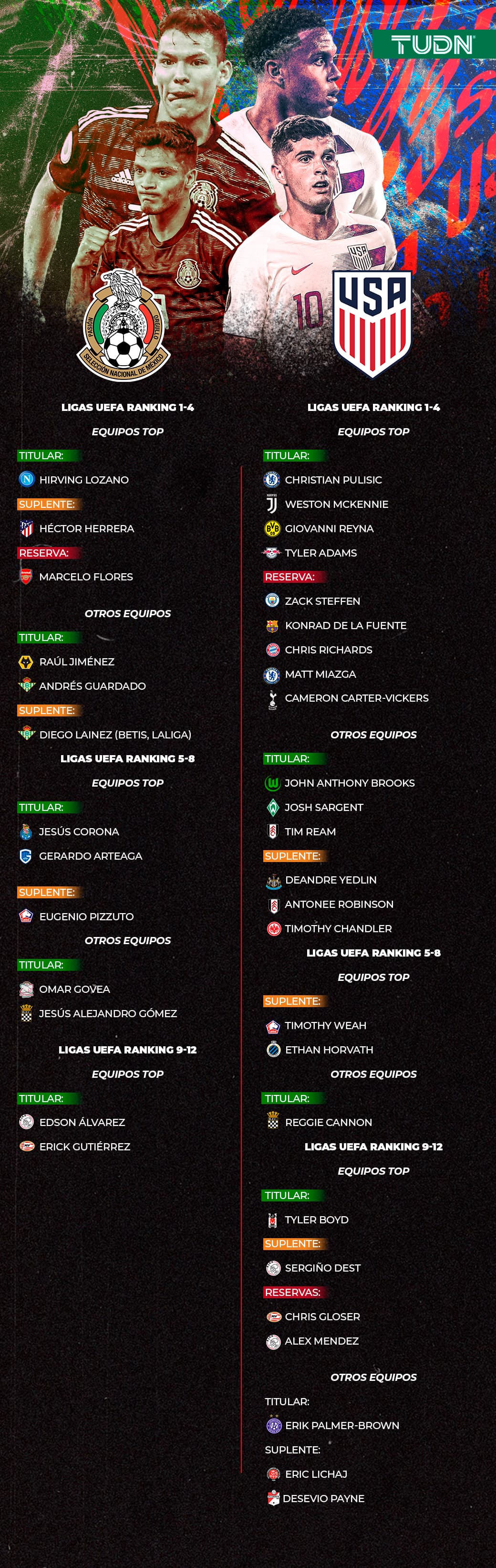 Por parte del combinado nacional mexicano solo hay cinco jugadores titulares en equipos top de las ligas europeas y cuatro más en equipos que no son top. Tiene un total de nueve jugadores titulares en Europa.