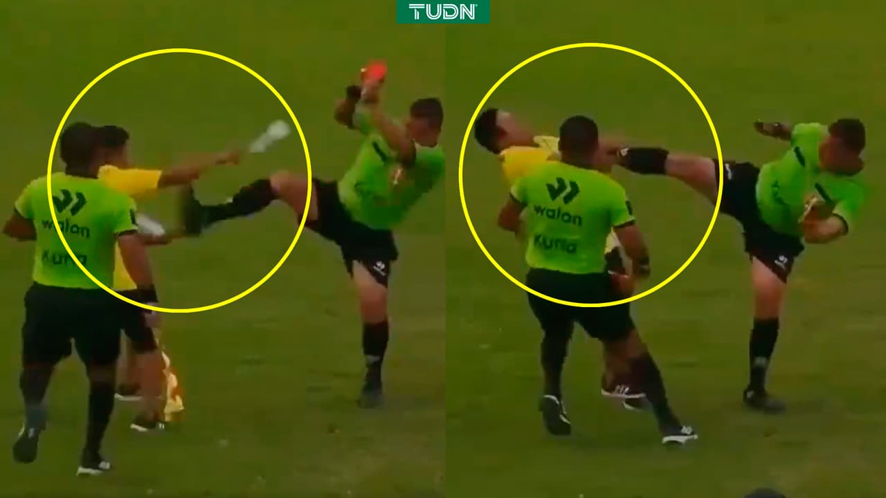 El asistente intentó agredir al árbitro que no dudó en defenderse y sacó una patada karateca que impactó en el rostro de agresor que cayó noqueado al césped.