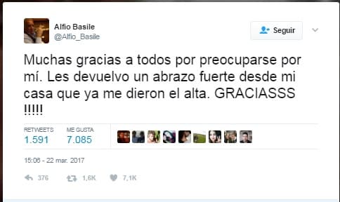 "Muchas gracias a todos por preocuparse por mí. Les devuelvo un abrazo fuerte desde mi casa que ya me dieron el alta. GRACIASSS !!!!!", escribió Basile, de 73 años.