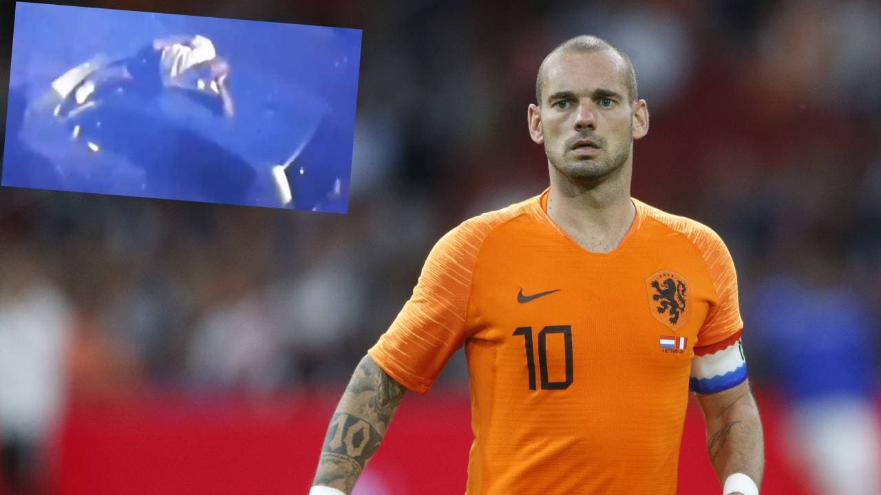 El medio neerlandés emitió este fin de semana unas imágenes en las que se ve a un hombre con camiseta blanca acostado encima del toldo de un vehículo, y que según ‘Shownieuws’ es Sneijder. El programa añadió que la policía acudió al lugar del incidente alertada por los vecinos, que se quejaron del ruido, y cuando llegaron vieron que el vehículo había sufrido daños considerables.