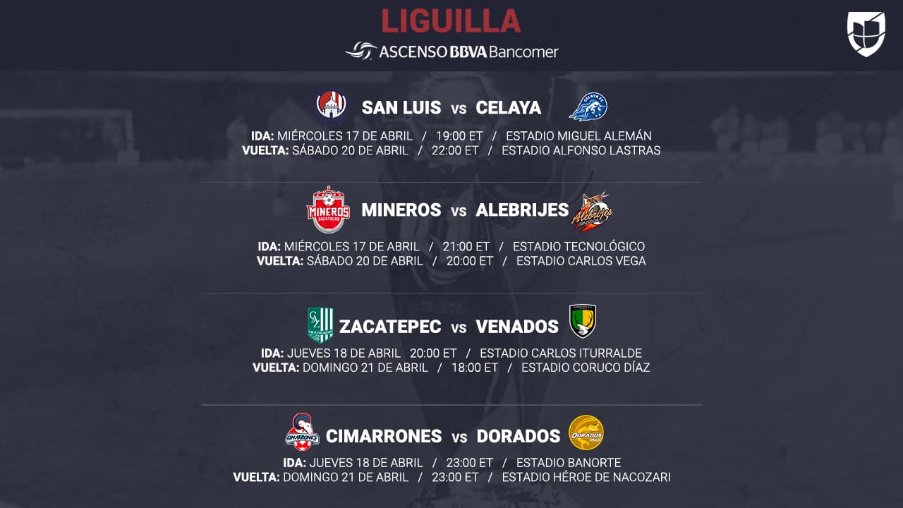 Esos mismos días, Alebrijes recibirá a Mineros a las 21:00 ET en el Estadio Tecnológico. El segundo duelo se llevará a cabo a las 22:00 En el Carlos Vega de Zacatecas.