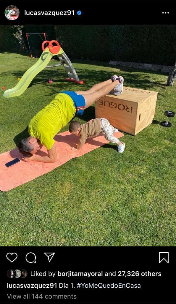 Los madridistas Lucas Vázquez y Raphael Varane también subieron fotografías en las que se muestra cómo se ejercitan desde casa, solos o en compañía de sus familias.