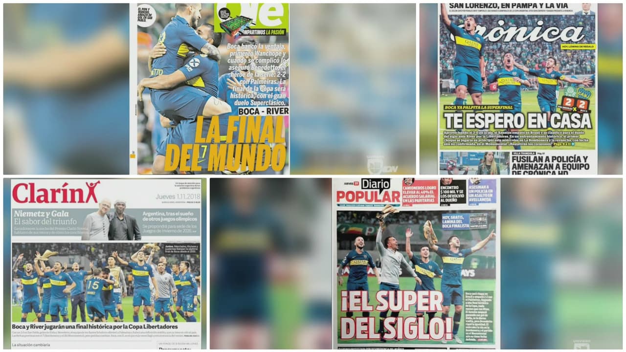 Boca Juniors y River Plate se medirán, por primera vez en su historia, en la final del campeonato de clubes suramericano. El Superclásico encendió las portadas. Olé tituló: La final del mundo