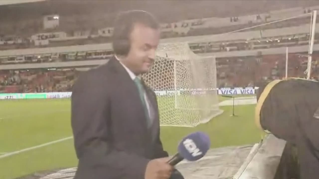 Cuando se disponía a dar información del partido entre México y Chile en La Corregidora, Méndez debió retirarse del gramado luego de que se activara el sistema de riego.