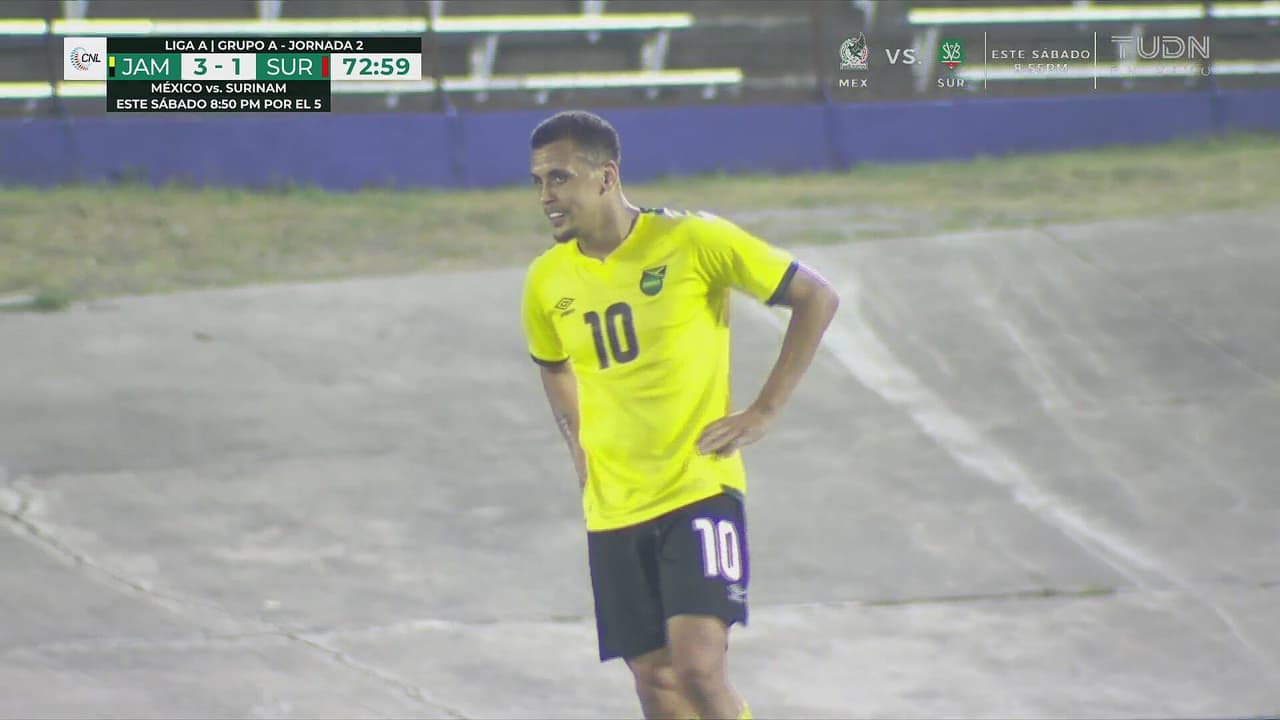 La defensa de Surinam se duerme y con un cañonazo pone a prueba al guardameta, al 73'.