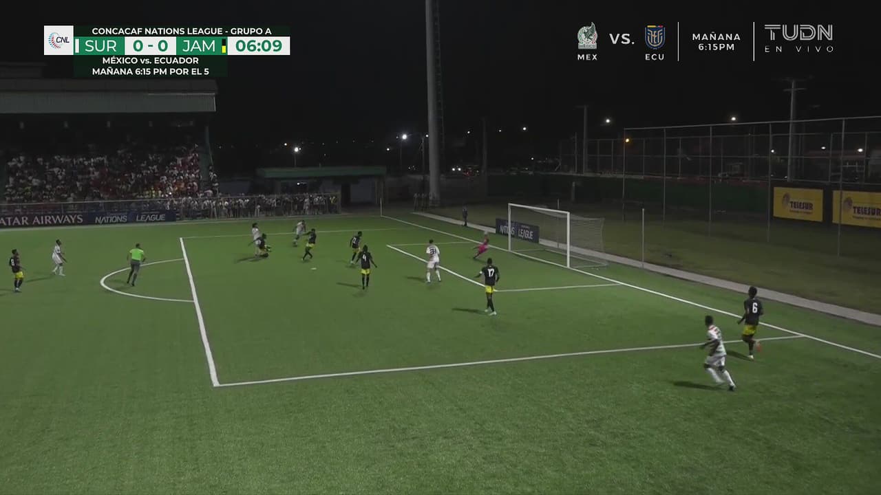 El atacante de Surinam se animo a disparar después de que dejan correr la jugada y casi anota, al 6'.