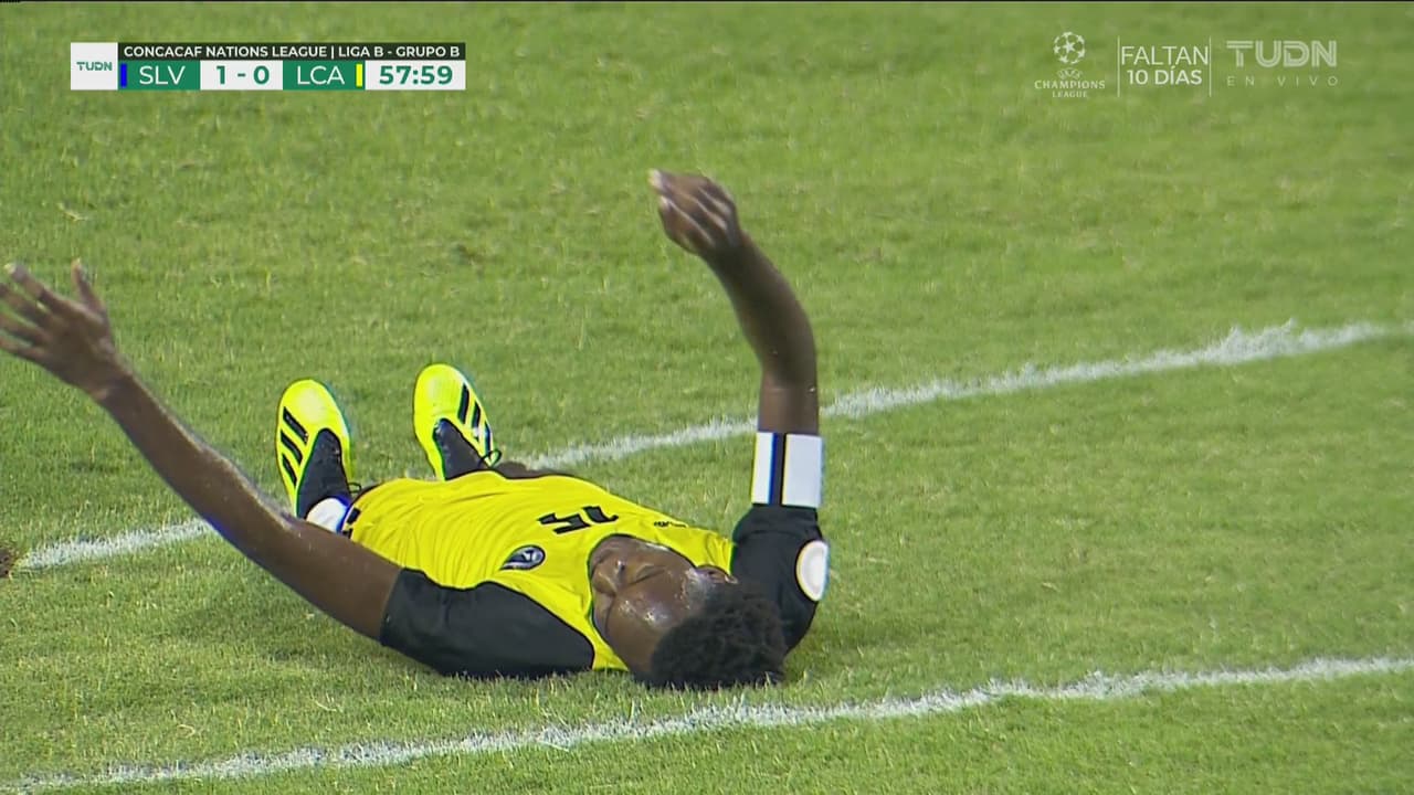 Darwin Cerén remata con fuerza y Melvin Doxilly recibe el balonazo. El defensor cae sobre el terreno juego por unos minutos.
