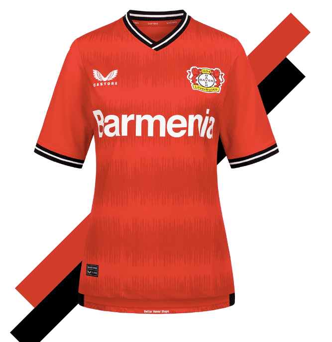 La nueva playera del Leverkusen mantuvo su tradicional color rojo con una franjas horizontales difuminadas en color negro para darle un aspecto innovador y moderno, mientras que la combinación puede ser con short rojo o negro.