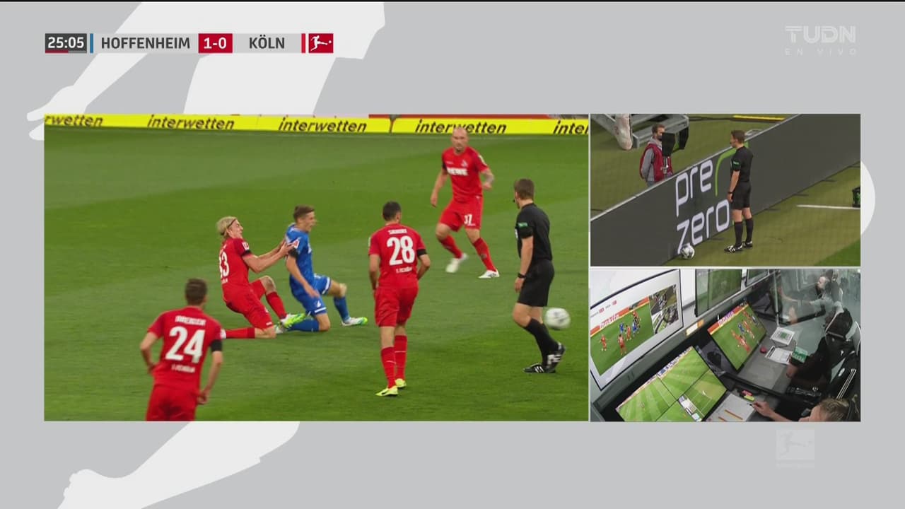 El defensa belga del Köln llegó tarde a la jugada y por poco rompe a Christoph, volante del Hoffenheim. El club de Colonia se queda con 10 en el primer tiempo.
